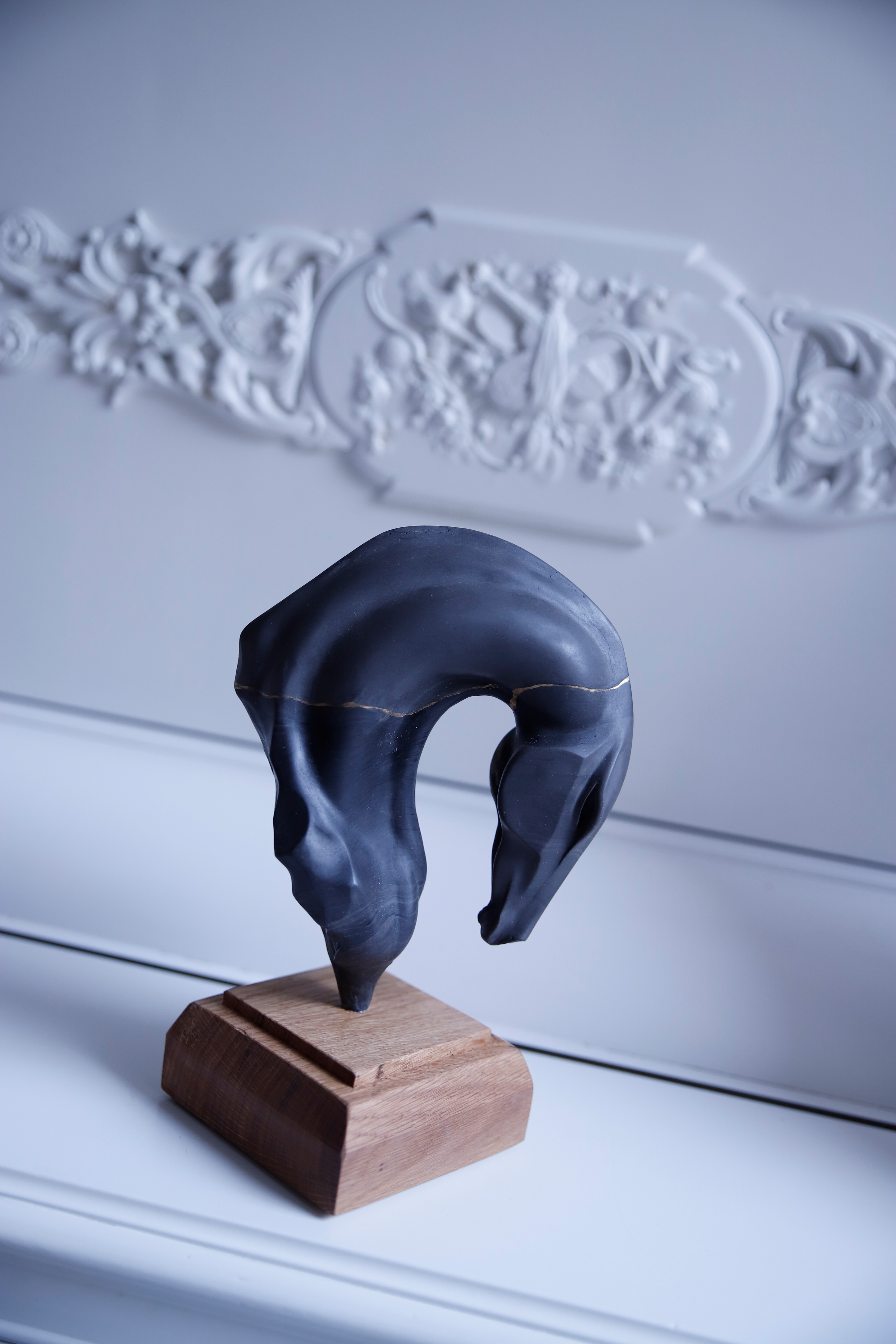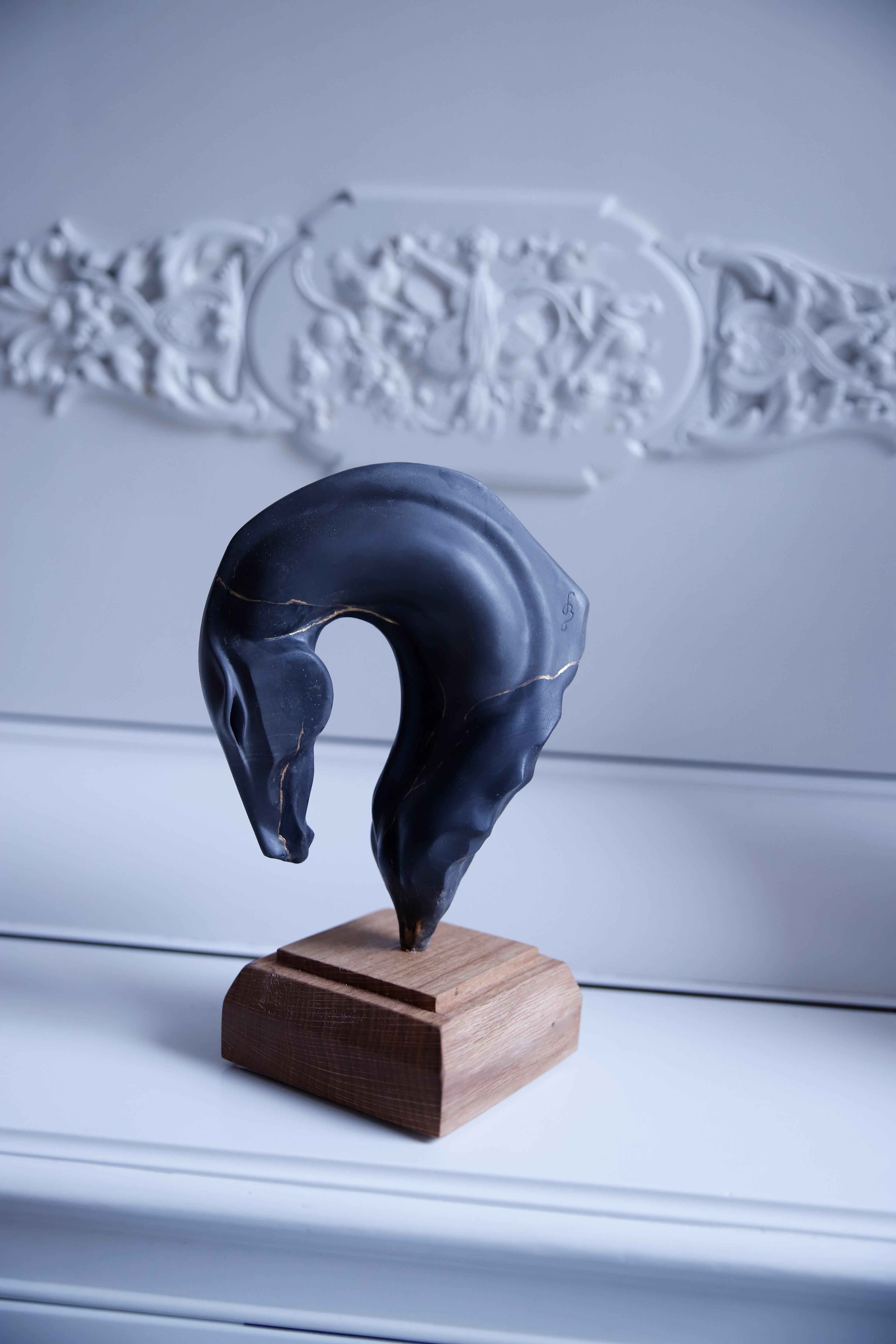 Black Spirit sculpture with oak stand